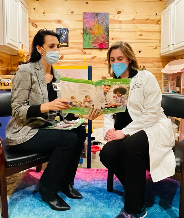 Pictured below are Dr. Diana Tacelosky, Ph.D, MD and Gwen West, MSW, LCSW, RPT, CAS discussing play therapy and how they can work together to meet needs of patients.